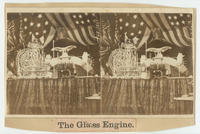 Unmounted stereographs showing the Bohemian Glass Blowers' glass steam engine, the "Monitor," on display on Union Avenue.