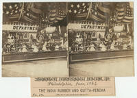 Unmounted stereograph shows goods made of rubber and pre-plastic materials displayed on a booth in the India Rubber and Gutta-Percha
