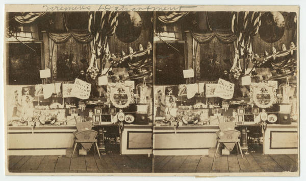 Unmounted stereograph shows firefighting memorabilia in the Firemen's Department. Identifiable items include portraits, helmets, a fire horn and a churn collected and displayed in a booth. The Great Central or Sanitary Fair held June 7-28, 1864 on Logan Circle was one of several national fairs that displayed art, craft, and historical exhibits to benefit the U.S. Sanitary Commission, a soldier relief organization.