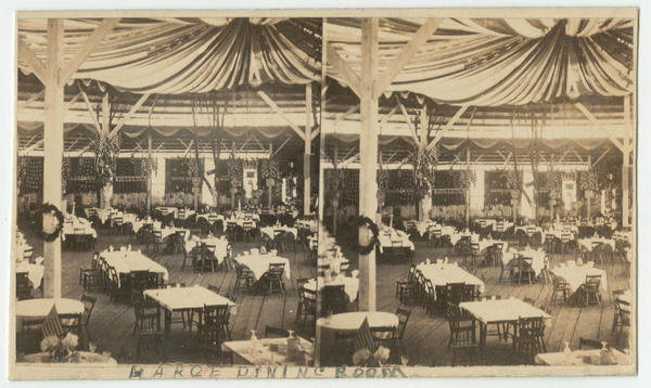 Unmounted stereograph shows tables set and prepared for patrons in the large dining room. American flags and garland adorn the columns in the large hall. The Great Central or Sanitary Fair held June 7-28, 1864 on Logan Circle was one of several national fairs that displayed art, craft, and historical exhibits to benefit the U.S. Sanitary Commission, a soldier relief organization.