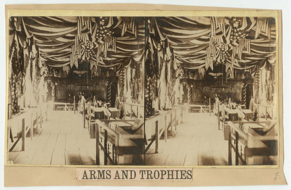 Unmounted stereograph shows cannons on display in the Arms and Trophies Department, which is covered in patriotic bunting. The Great Central or Sanitary Fair held June 7-28, 1864 on Logan Circle was one of several national fairs that displayed art, craft, and historical exhibits to benefit the U.S. Sanitary Commission, a soldier relief organization.