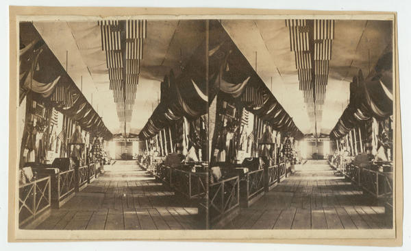 Unmounted stereograph shows a long, wide corridor flanked by displays of small machinery. Patriotic bunting hangs from the ceiling and walls and a banner reading "Agricultural Machinery" hangs at the end of the hall. The Great Central or Sanitary Fair held June 7-28, 1864 on Logan Circle was one of several national fairs that displayed art, craft, and historical exhibits to benefit the U.S. Sanitary Commission, a soldier relief organization.