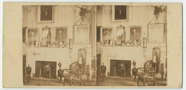 Shows a parlor south of Union Avenue filled with William Penn's relics, including paintings, antique chairs and furniture,