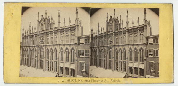 View looking northwest at the front facade of the hall built 1853-1855 after the designs of Sloan & Stewart. Includes a partial view of the Washington House hotel (709-711 Chestnut Street). Building sold circa 1873 following the completion of the new Masonic Temple on North Broad Street.