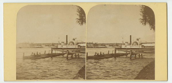 View shows the passenger steamer built 1854 by Harlan & Hollingsworth on the Delaware River. Also shows people sitting on the floating dock at the pier in the foreground. Buildings facing the river on the opposite side are also visible.