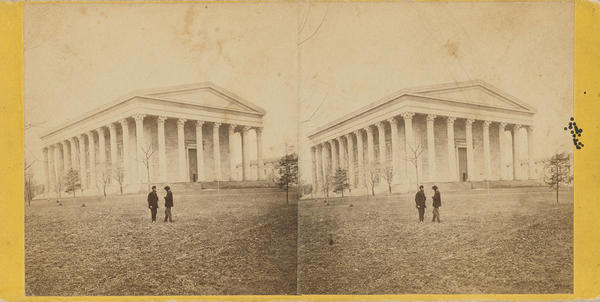View looking southwest showing Founder's Hall constructed 1833-1847 in the Greek Revival Style after the designs of Philadelphia architect Thomas Ustick Walter. Also shows a partial view of a neighboring building right of the hall and two men standing in the grass in the foreground. Girard College was established through a bequest from Stephen Girard, a Philadelphia financier and philanthropist, for the creation of a school for "poor white orphans."