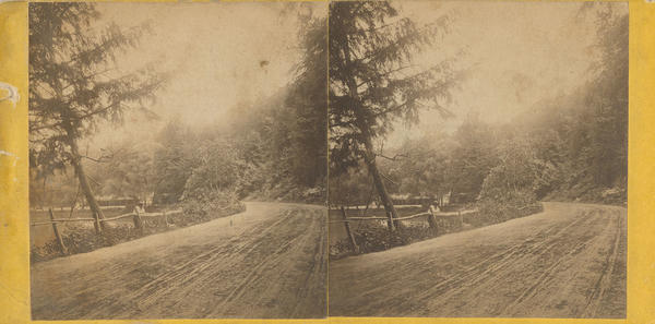 View of a man leaning against the fence of a winding dirt road flanked by trees below Gypsy Lane near Wissahickon Creek. The stables for Wissahickon Hall, the hostelry erected circa 1849 by Harry Lippen, are also visible in the distance.