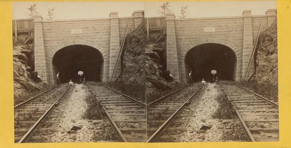 Views show two sets of railroad tracks running under the stone arch of the Market Street Tunnel, built by the Junction Railroad