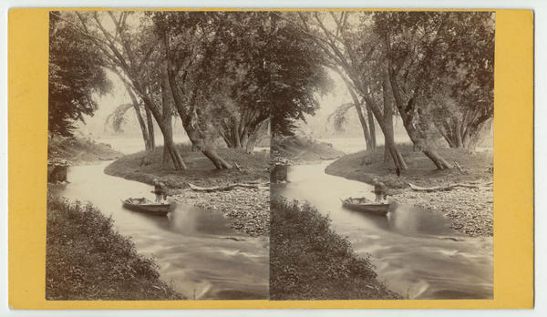 Views of men steadying or rowing canoes on the tree-lined creek near Stranger Hollow and Catawissa Island. Catawissa Creek