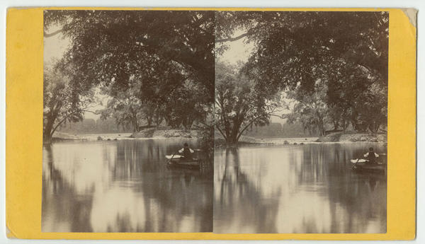Views of men steadying or rowing canoes on the tree-lined creek near Stranger Hollow and Catawissa Island. Catawissa Creek