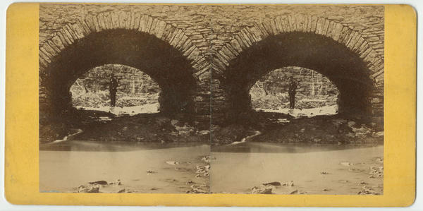 View of a stone arch tunnel under which the shallow Silver Brook passes. A man stands in profile in front of a stone wall on the other side of the tunnel.