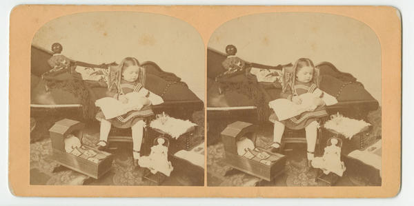 Genre photograph showing a young white girl, wearing her hair in ringlets and attired in a dark-colored dress with decorative white piping, white stockings, and black shoes, sitting in a rocking chair in front of a chaise lounge. She holds her white porcelain doll in her arms like a baby. A doll's cradle sits at the girl's feet along with doll’s chair on which a cloth white doll sits. A Black cloth doll is propped on the lounge behind the girl. In the right is a small side table with a glass mug.