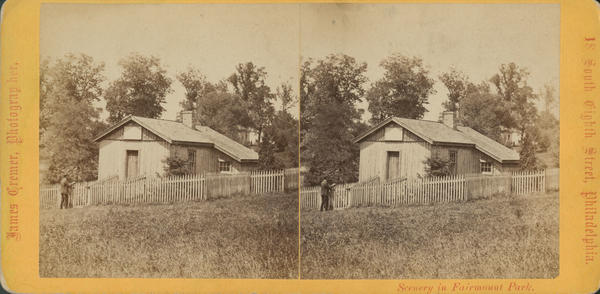 View showing the cabin used by Lieutenant General Ulysses S. Grant on the east side of Carriage Drive in Fairmount Park. A man stands at the picket fence surrounding the cabin. Served as Grant's headquarters and the supply center for the Union armies during the seige of Richmond. Moved to Philadelphia circa 1870 from City Point, Virginia as a gift to citizens of Philadelphia for their support during the Civil War. Transfered back to Virginia and rebuilt there in 1983.