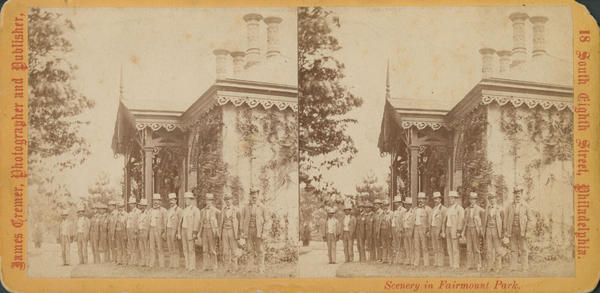 View showing a group of uniformed park guards standing in a row in front of Sedgley estate's tenant's cottage, also known as the Porter House, used as a guard house and jail after the estate was purchased by the city for incorporation into Fairmount Park in 1857. Benjamin Henry Latrobe designed the extant cottage and the mansion built 1799 for William Cramond on the east bank of the Schuylkill River.