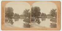 View showing men, women and children sitting and standing around a pond in Lincoln Park, Chicago. Also shows geese in the water, a small gazebo, and trees.