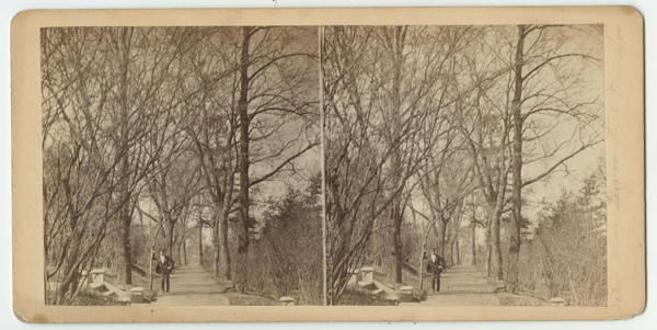 View showing a tree-lined pathway on the Lemon Hill estate in East Fairmount Park. A man leans against a tree-trunk near a marble stairway in the foreground.