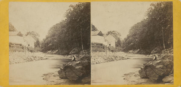 View showing mill buildings on the rocky banks of the Wissahickon Creek below the Red Bridge, later the Blue Stone Bridge. A man sits on a large rock on the opposite the tree-lined bank.