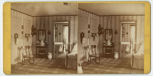 mirrors, beds, and wash basins. Several views include John McAllister, Jr., with an unidentified man in one view, sitting