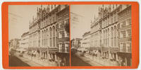 View looking northwest at the front facade of the hall built 1853-1855 after the designs of Sloan & Stewart. View also shows adjacent businesses with bare awnings, including the Washington House hotel (709-711 Chestnut), and other commercial store fronts west of the hall. Flags fly from 712 Chestnut in the foreground, one reads "one dollar, 712" A horse-drawn cart travels east on Chestnut Street in the distance. Building sold circa 1873 following the completion of the new Masonic Temple on North Broad Street.