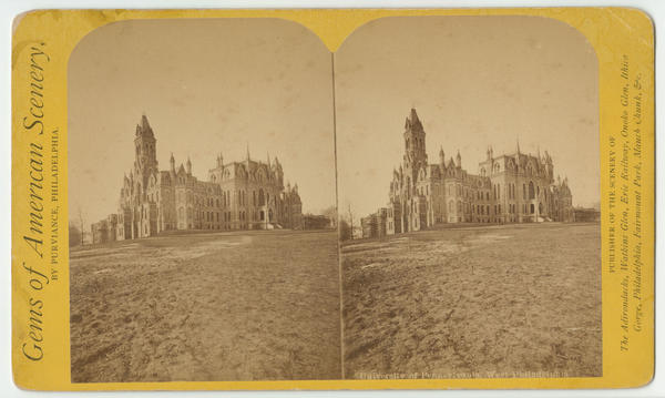 View of the university building constructed 1871-1872 after the designs of Thomas Webb Richards on the university campus in West Philadelphia. Also shows scaffolding surrounding adjacent buildings being constructed on the campus. University of Pennsylvania, founded by Benjamin Franklin in 1751, relocated to West Philadelphia in 1875.