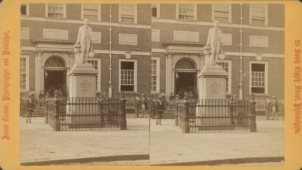 View showing the George Washington marble statue sculpted by Joseph A. Bailly enclosed in ironwork fencing in front of Independence Hall. Statue rests on pedestal inscribed "Erected by the Washington Monument Association of the First School District of Pennsylvania July 4, 1869." Also shows spectators in the background.