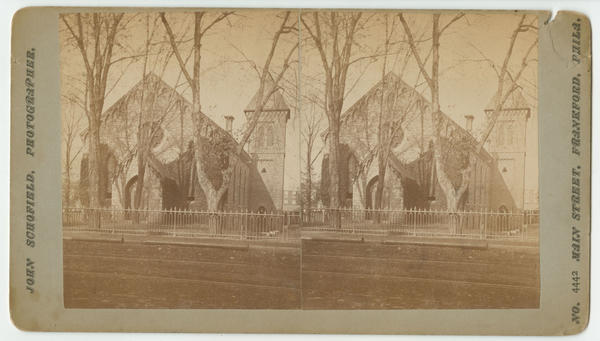 Exterior view looking west at the front elevation of the Protestant Episcopal church's second building, built in 1848 on Frankford Avenue (i.e., Main Street). Includes bare trees on the property. Front partially covered in ivy. Demolished ca. 1896.