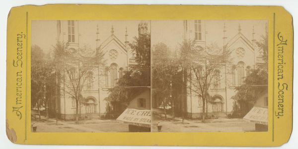 Exterior view of Romanesque-style church across the street from a confectionery shop with an awning advertising ice cream and "Debbold's pure candies".