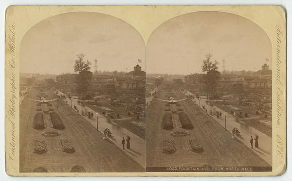 Rooftop view of Fountain Avenue from Horticultural Hall, designed by Hermann Schwartzmann, showing the landscaped grounds flanking the wide entrance path, including flower beds, trees, bushes, decorative planters and fountains. Includes pedestrians promenading along Fountain Avenue and includes partial views of the music pavilion, Women's Pavilion and U.S. Government Building. The fair celebrated the centennial of the United States through an international exhibition of industry, agriculture, and art.