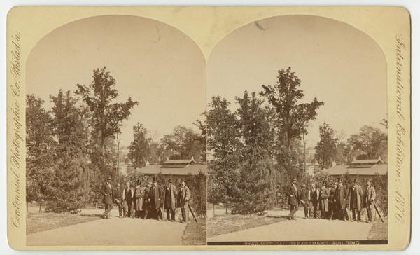 View showing a group of seven men and two women standing on a path leading to the Medical Department Building designed by Herman J. Schwarzmann. Trees surround the building and obscure views of other fair buildings in the background. The fair celebrated the centennial of the United States through an international exhibition of industry, agriculture, and art.