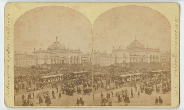 View showing a large crowd of visitors gathered around and on top of Memorial Hall (i.e., Art Gallery, built 1874-1876 after designs by Hermann J. Schwarzmann) on Opening Day on May 10, 1876. Pedestrians, many with parasols, walk toward the speakers' stands to hear President Ulysses S. Grant speak. Includes two West End Passenger Railway Company streetcars in the foreground. The fair celebrated the centennial of the United States through an international exhibition of industry, agriculture, and art.