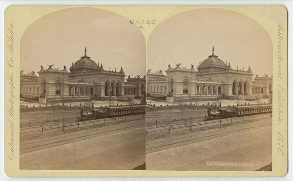 Oblique view showing the front and west flank of the exhibition hall, also known as the Art Gallery, built 1874-1876 after designs by Hermann J. Schwarzmann. In the foreground, a locomotive pulls open-air coaches west, parallel to the Avenue of the Republic. The fair celebrated the centennial of the United States through an international exhibition of industry, agriculture, and art.
