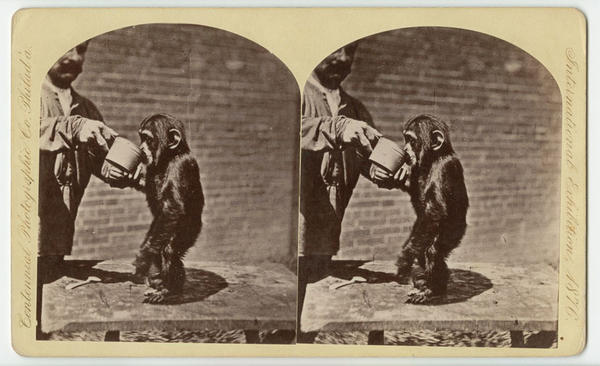 Chimpanzees. Zoological Garden, Philada. From Africa. Age, 4 years. [graphic] / Centennial Photographic Co., International Exhibition, Philadelphia. Wm. Notman, President. W. Irving Adams, Vice Pres't. Edward L. Wilson, Sup't. & Treasurer. J.A. Fraser, Art Superintendent.