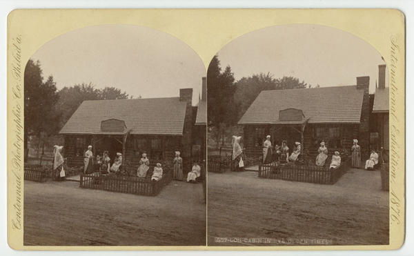 Views of Colonial-style log cabin (i.e., the New England Log House) with a sign reading "Ye olden time" on the roof. Female reenactors dressed in Colonial garb sit and stand in the fenced-in front yard. The fair celebrated the centennial of the United States through an international exhibition of industry, agriculture, and art.