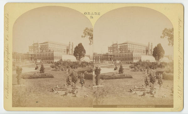 View of the west front and south flank of Horticultural Hall, designed by Hermann J. Schwartzmann, showing flower beds, trees, bushes and decorative planters. The fair celebrated the centennial of the United States through an international exhibition of industry, agriculture, and art.