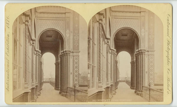 Exterior views showing the horseshoe arch and arabesque designs decorating the portico on the upper stories of Horticultural Hall designed by Hermann J. Schwarzmann. The fair celebrated the centennial of the United States through an international exhibition of industry, agriculture, and art.