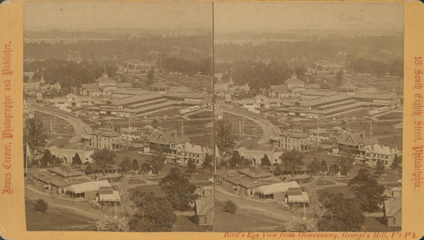 Series of bird's eye views depict the Centennial Exhibition's landscaped grounds in West Fairmount Park from George's Hill