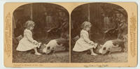 Genre view of a barefoot girl, seated and holding a spoon, as a pig eats from a bowl in front of her.