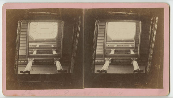 Interior view showing a square staircase and skylight of the building that served as Boston's third City Hall from 1865 to