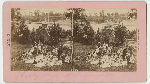 View showing a group of women and children assembled on the grass on Lemon Hill estate. The Philadelphia Girls' Rowing Club boathouse, built 1860-1861 after designs by James C. Sidney for the Philadelphia Skating Club and Humane Society, is visible on the east bank of the Schuylkill River in the background.