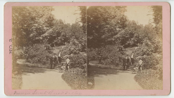 View showing four men and a toddler in a stroller standing on the steps of a rustic pedestrian bridge on the Sweetbriar estate in West Fairmount Park.