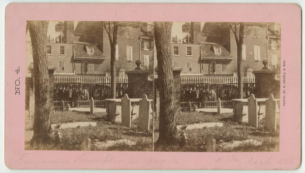 View showing the flat headstone over the grave of Benjamin Franklin in Christ Church cemetery at 420-424 Arch Street. Includes adjacent headstones, a large crowd of spectators looking at the grave from behind an iron fence, and the front facades of buildings on Arch Street behind the cemetery.