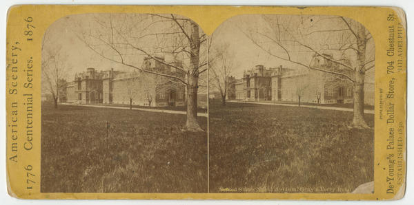 Oblique, exterior view of Laning Hall of the U.S. Naval Asylum, a convalescence home for retired sailors, constructed 1864-1868 after designs by John McArthur, Jr. at the southwest corner of Gray's Ferry Avenue and Twenty-fourth Street. Replaced original hospital in Biddle Hall.