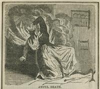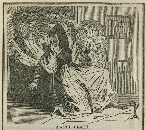Full-length portrait of Mrs. Crawford, burning to death, with a pipe on the floor nearby.
