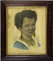 Bust-length portrait of a young African American woman facing slightly right. Sitter is attired in gold drop earrings with red stones, a three-strand gold necklace with a gold pendant, and a blue dress with a white lace collar.