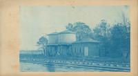 Depicts a small brick building next to two water tanks adjacent to the railroad tracks. Three men and a child stand nearby.