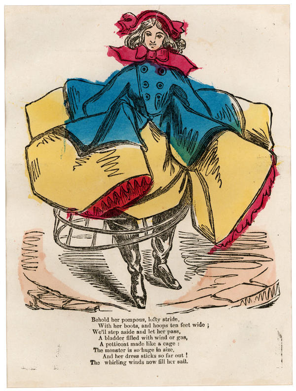 Text: Behold her pompous, lofty stride, / With her boots, and hoops ten feet wide; / We'll step aside and let her pass, / A bladder filled with wind or gas, / A petticoat made like a cage: / The monster is so huge in size, / And her dress sticks so far out! / The whirling winds now fill her sail.