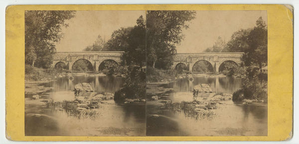 Landscape view showing the three-span stone arch Pennypack Creek Bridge (i.e., Frankford Avenue Bridge) from the tree-lined creek. Bridge built 1697-1698.