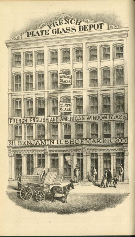 Frontispiece showing the five-story storefront of the window and plate glass dealer at 205-211 North Front Street. Signage adorns the building and reads "French Plate Glass Depot"; "French, English and American Window Glass"; "Plate Glass"; and "Window Glass." A patron enters one of the entryways near a couple with their child walking on the sidewalk. Two men, possibly the proprietor and a clerk, stand in adjacent entries and watch drayman unload large boxed sheets of glass from a horse-drawn cart in the street. Shoemaker established his glass depot in 1855 when he left the druggist business of his brother Robert Shoemaker. Shoemaker served as president of the Pennsylvania Hospital for several years.