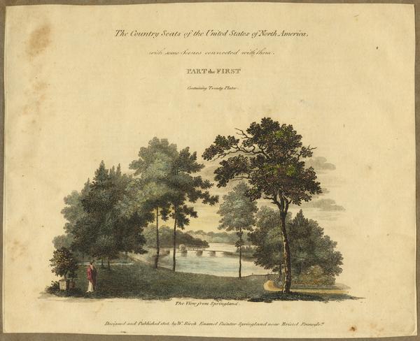 Title page to first edition, later subtitle plate containing "The View from Springland" depicting the Neshaminy Creek and lush grounds near William Birch's estate in Bucks County. Birch resided at the estate from 1798 to 1818. View includes a woman standing near a potted tree, an abandoned bridge, and the abandoned toll house converted by Birch into his studio.