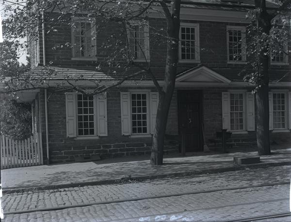 Exterior views of the front façade of the former residence of John Johnson built 1765-1768 by master builder Jacob Knor at 6306 Germantown Avenue, Philadelphia, PA. Shows the front door with a shingled awning flanked by shuttered windows. A broom is propped against the doorframe. Two trees grow in the sidewalk in front of the house. Partial view of the picket fence in the left. John Johnson resided in the house during the Battle of Germantown. The dwelling sustained damage including a hole in the parlor door caused by a cannon ball and a chipped corner. It served as a station on the Underground Railroad. The Johnson family owned the house until 1908. The Woman's Club of Germantown purchased the house in 1917, and in 1980, gifted the house and its contents to the Germantown Mennonite Historic Trust to operate as a house museum. In 2002, the deed of ownership was transferred to the Johnson House Historic Site, Inc.